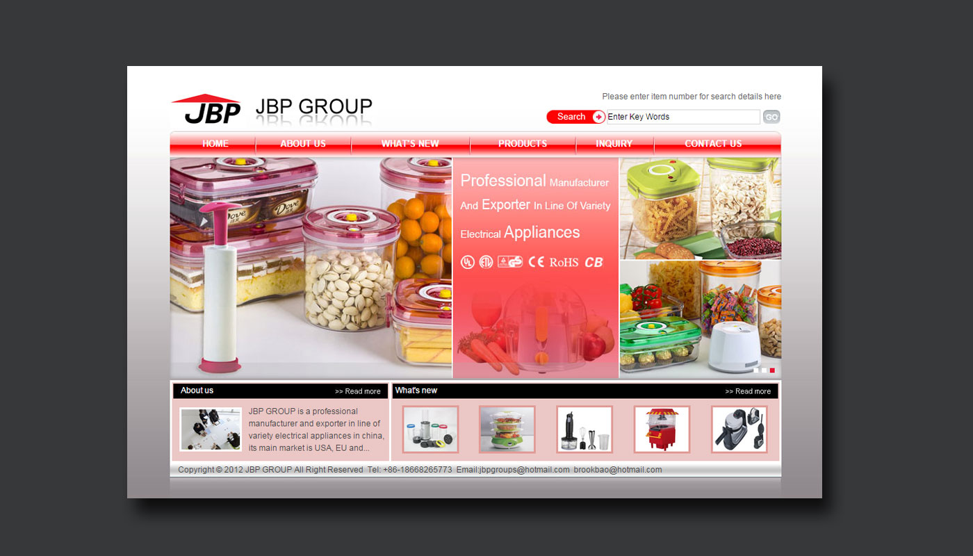 JBP GROUP is a professional manufacturer and exporter in line of variety electrical appliances in china, its main market is USA, EU and South American. With the development of many years, currently our products cover kitchen small electric appliances such as cooking items, blending items and heating items with UL, ETL, GS, CE, RoHs, CB etc